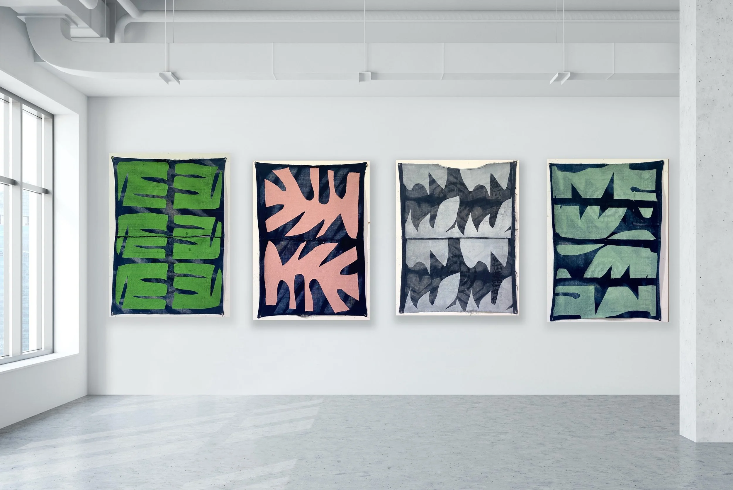 The Space Between, Approx. 24x36 each, natural dye and acrylic on vintage Japanese canvas, 2025